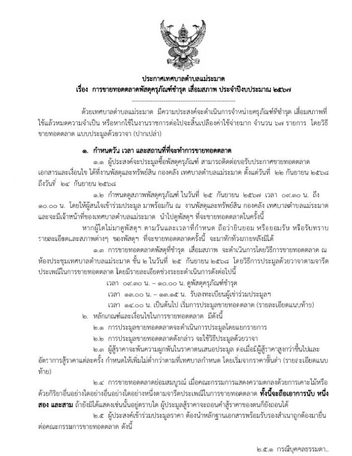 ประกาศเทศบาลตำบลแม่ระมาด เรื่อง การขายทอดตลาดวัสดุครุภัณฑ์ชำรุดเสื่อมสภาพ ประจำปีงบประมาณ 2567