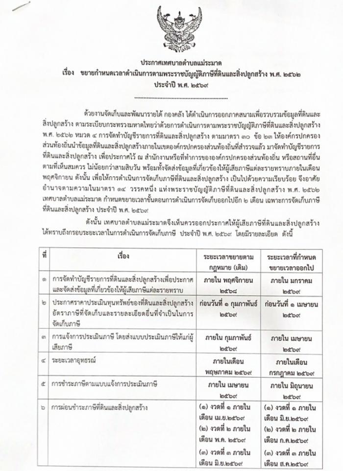 ประกาศเทศบาลตำบลแม่ระมาด เรื่อง ขยายกำหนดเวลาดำเนินการตามพระราชบัญญิตภาษีที่ดินและสิ่งปลูกสร้าง พ.ศ.2562 ประจำปี 2569