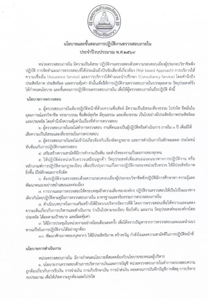 นโยบายและขั้นตอนการปฎิบัติงานตรวจสอบภายใน ประจำปีงบประมาณ พ.ศ.2569