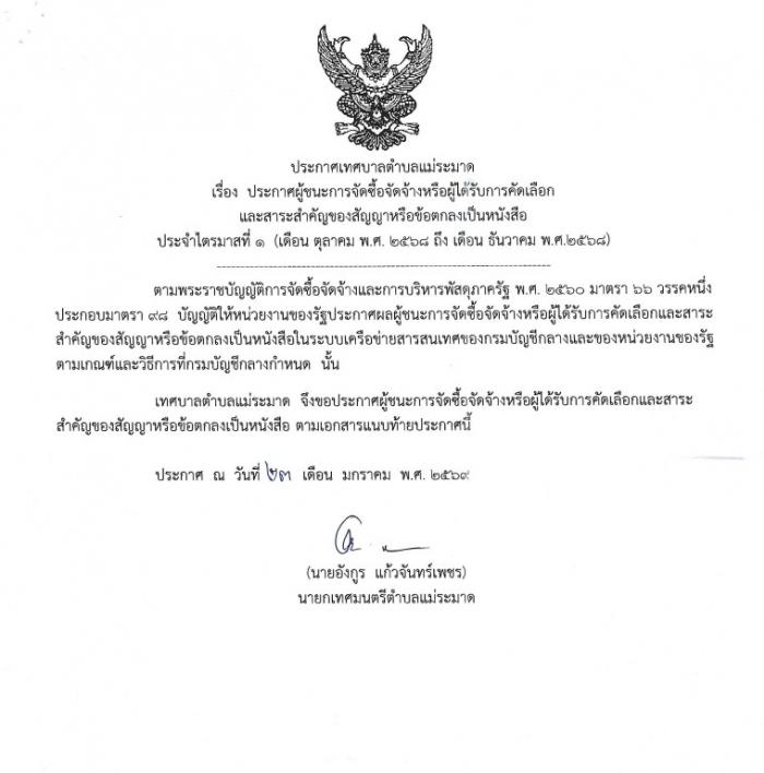 ประกาศผู้ชนะการจัดซื้อจัดจ้างหรือผู้ได้รับการคัดเลือกและสาระสำคัญของสัญญาหรือข้อตกลงเป็นหนังสือ ประจำไตรมาสที่ 1 (ตุลาคม 2568 ถึง ธันวาคม 2568)