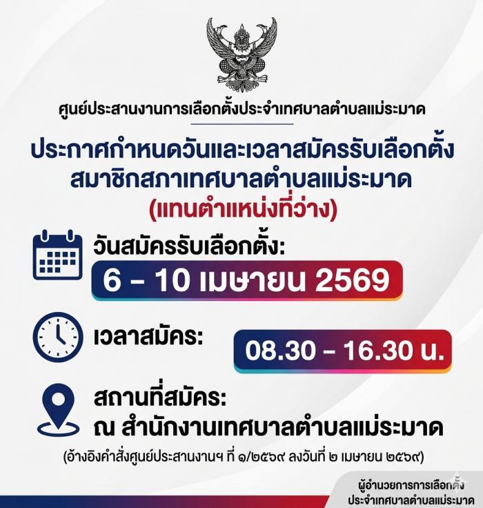 ศูนย์ประสานงานการเลือกตั้งประจำเทศบาลตำบลแม่ระมาดประกาศกำหนดการสมัครรับเลือกตั้ง สมาชิกสภาเทศบาลตำบลแม่ระมาด(แทนตำแหน่งที่ว่าง)